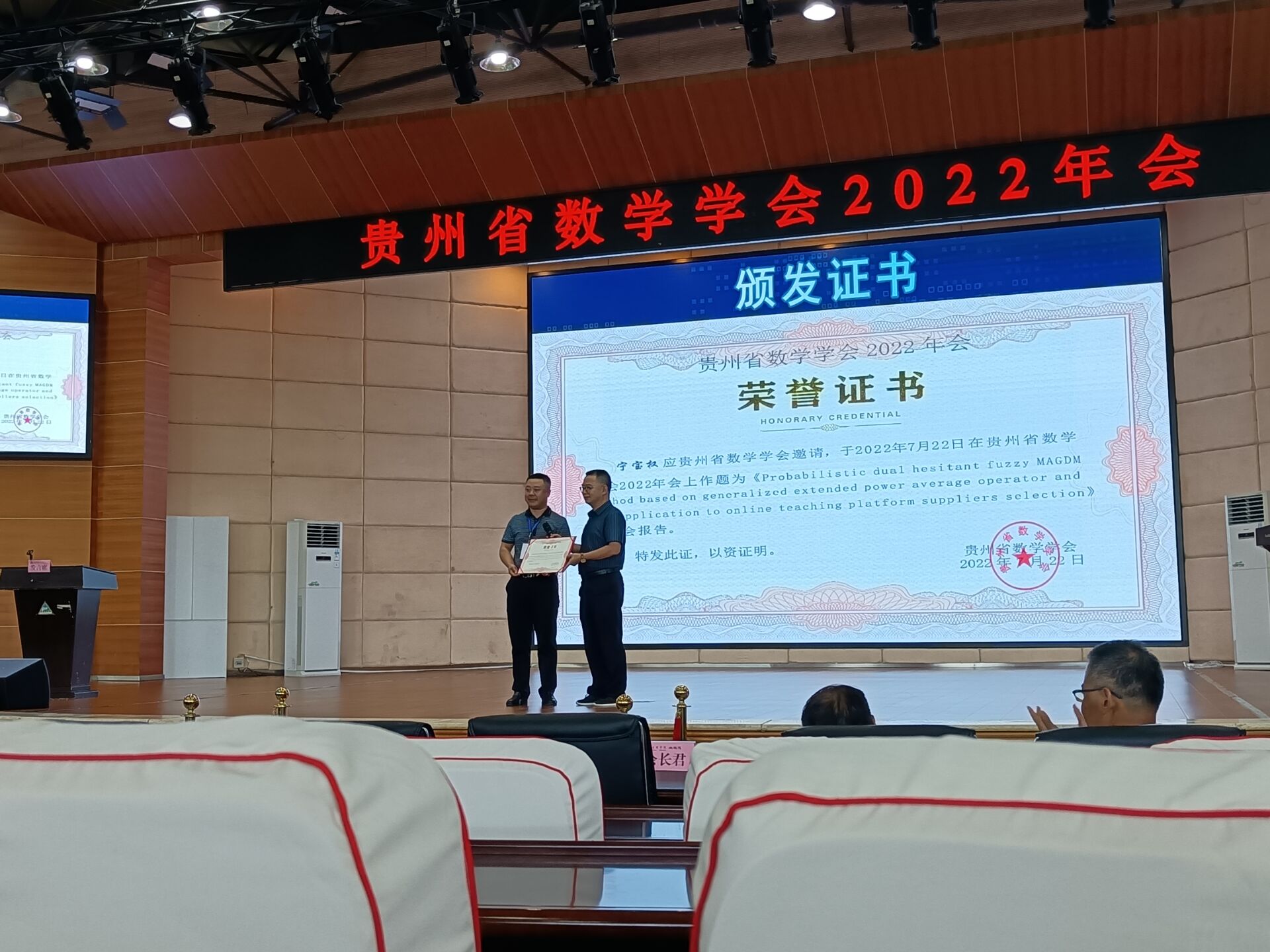 会上,宁宝权被选为贵州省数学会常务理事,并被邀请作了大会报告,他从概率对偶犹豫模糊集目前研究中存在的问题出发,分析了关于概率对偶犹豫模糊集需要进一步探讨的问题,针对概率对偶犹豫模糊元的距离测度、得分函数以及权重确定方法等方面提出了一些新的观点,同时研究了能够处理决策属性间存在相关关系的概率对偶犹豫模糊集结算子,提出了概率对偶犹豫模糊环境下新的集结算子,并对集结算子的一些优良性质、特殊形式进行了详细的研究,基于新的集结算子提出了新的多属性群决策方法,并应用于在线教学平台供应商选择案例中,通过参数的敏感性分析以及与其他存在的方法的对比分析,进一步说明了提出的集结算子的灵敏性和有效性,且与参会人员进行了深入探讨,引起了与会专家学者的浓厚兴趣,并得到了一致好评。(供稿/杨应明 编辑校对/陈先康 审核/杨光强)