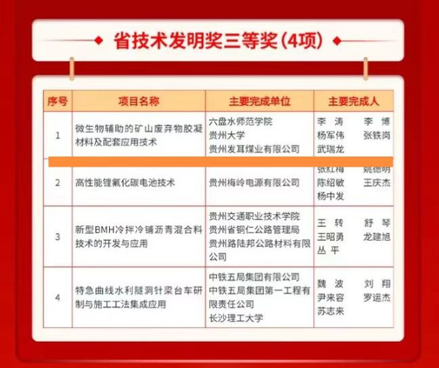 李涛教授作为第一完成人的科研成果“微生物辅助的矿山废弃物胶凝材料及配套应用技术”被授予贵州省技术发明奖三等奖。这也是六盘水师范学院作为第一完成单位,2023年度唯一获此奖项的科研成果。