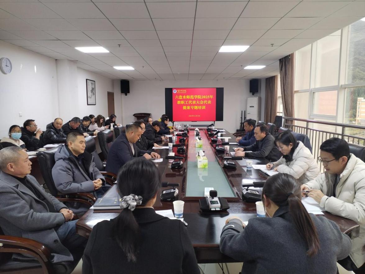 11月18日下午,学校2025年教职工代表大会代表提案工作专题培训在勤勉楼第三会议室举行。六盘水市政协委员、学校提案委员会委员、后勤服务中心副主任杨磊作专题辅导。学校第三届教职工代表大会提案委员会主任、工会副主席朱恩良主持。来自各学院各部门的教职工代表大会代表50余人参加培训。