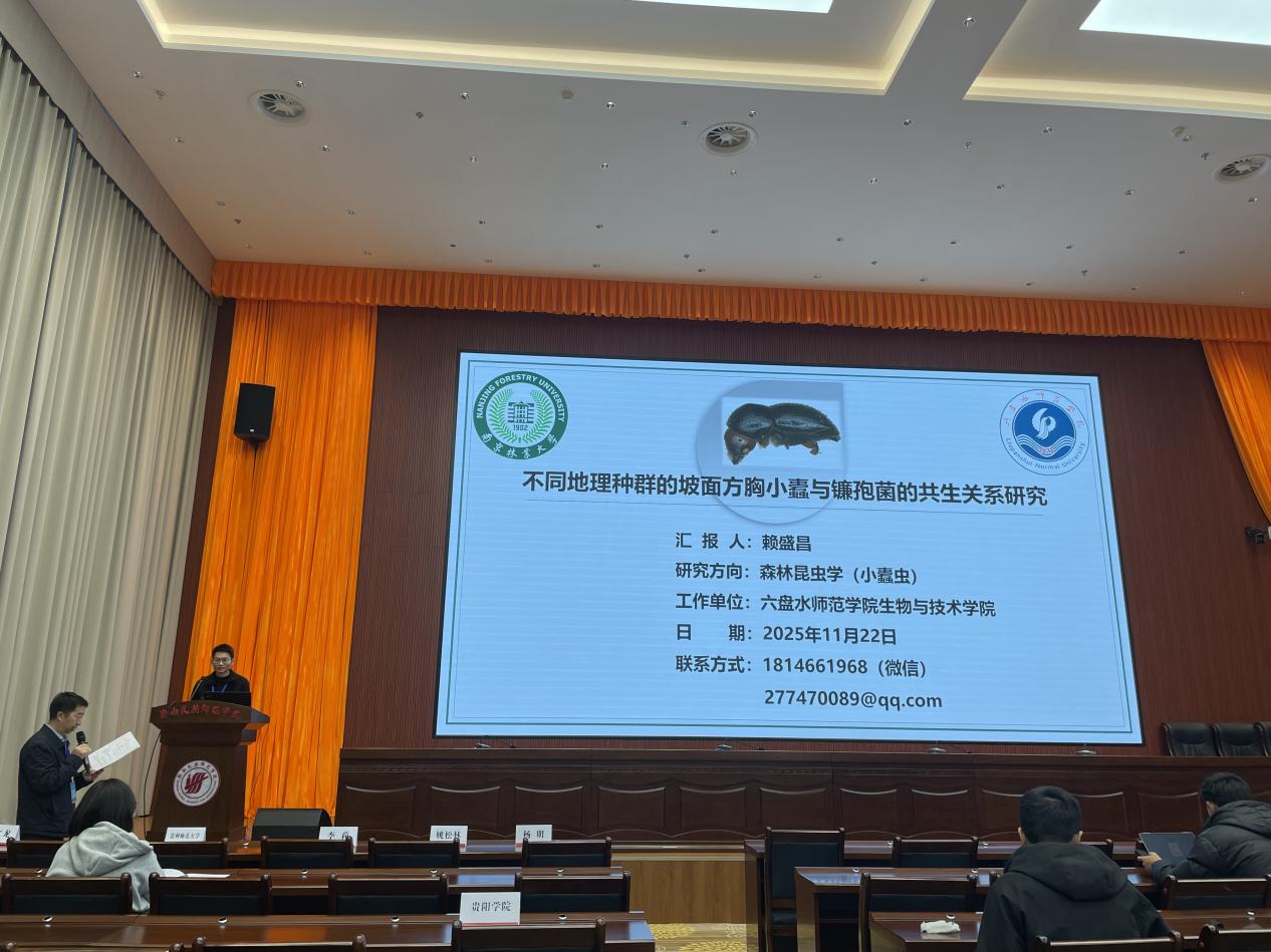 11月21日至23日,生物科学与技术学院苏成元、赖盛昌和黄贵强三位老师前往都匀市参加由贵州省昆虫学会主办,黔南民族师范学院和贵州大学昆虫研究所承办的“贵州省昆虫学会2025年学术年会”。苏成元老师作了题为“六盘水地区蝴蝶种群中Wolbachia专性WO噬菌体的超级感染及其orf7基因重组模式研究”的大会报告,赖盛昌老师作了题为“不同地理种群的坡面方胸小蠹与镰孢菌的共生关系研究”的大会报告。(供稿/黄贵强 编辑校对/尚雪英 王雪雪 审核/王家理)