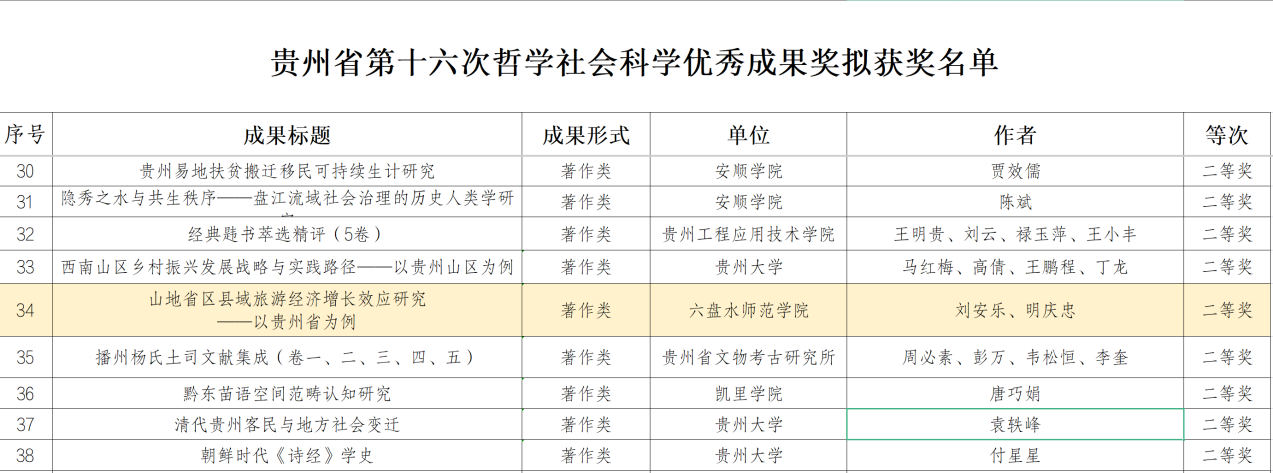 近日,贵州省人民政府设立的哲学社会科学领域最高奖项——贵州省第十六次哲学社会科学优秀成果奖获奖名单正式公布。我校刘安乐博士的著作《山地省区县域旅游经济增长效应研究——以贵州省为例》荣获二等奖,这一荣誉的斩获,充分彰显了我校教师在哲学社会科学研究领域的扎实功底与不懈追求。