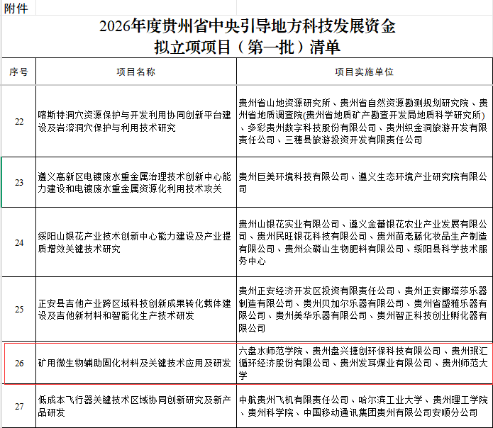 近日,贵州省科学技术厅发布了《2026年度贵州省中央引导地方科技发展资金拟立项项目(第一批)清单》公示,我校牵头申报的“矿用微生物辅助固化材料及关键技术应用及研发”项目成功获批。这是我校首次以承担单位身份获批中央引导地方科技发展资金支持项目。