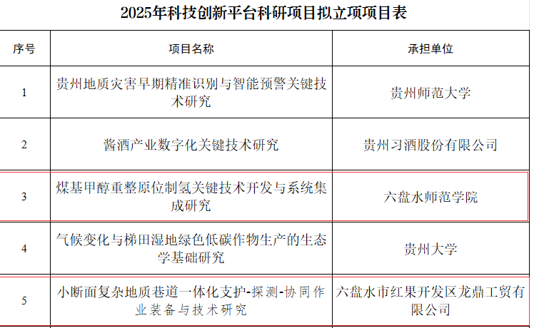 近日,贵州省科学技术厅发布《2025年科技创新平台科研项目拟立项项目公示》,我校作为承担单位申报的“煤基甲醇重整原位制氢关键技术开发与系统集成研究”项目获批,作为主要参与单位联合申报的“小断面复杂地质巷道一体化支护-探测-协同作业装备与技术研究”项目获批,这标志着我校在面向区域重大需求的关键技术研发方面迈上了新台阶。