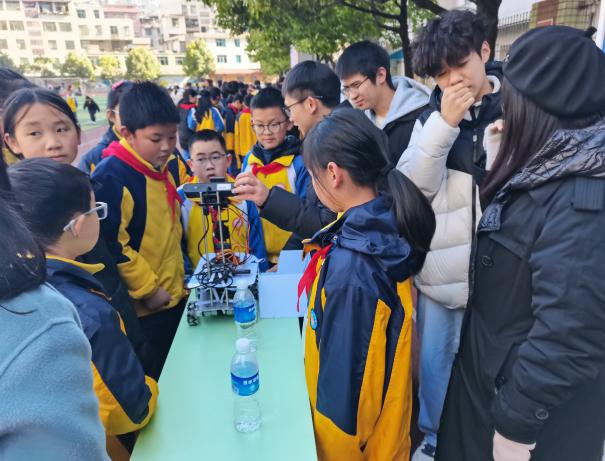 在互动体验环节,小学生们热情高涨,围绕各类科创作品有序观摩、积极提问,在“小讲师”的指导下亲手操作装置、感受科技魅力。“小讲师们”耐心回应每一个疑问,通过趣味实验延伸讲解科学原理,将抽象的科学知识转化为可感知、可操作的实践体验,有效激发了孩子们对科学探索的浓厚兴趣,让科学思维在实践互动中逐步养成。
