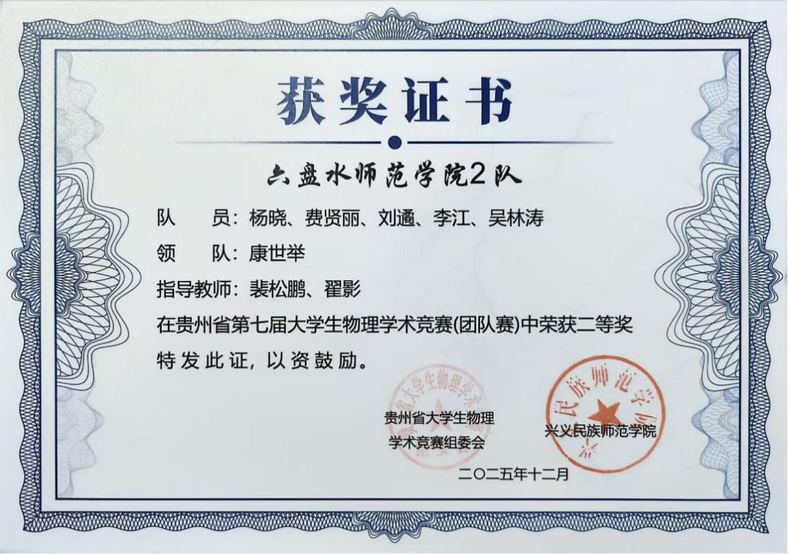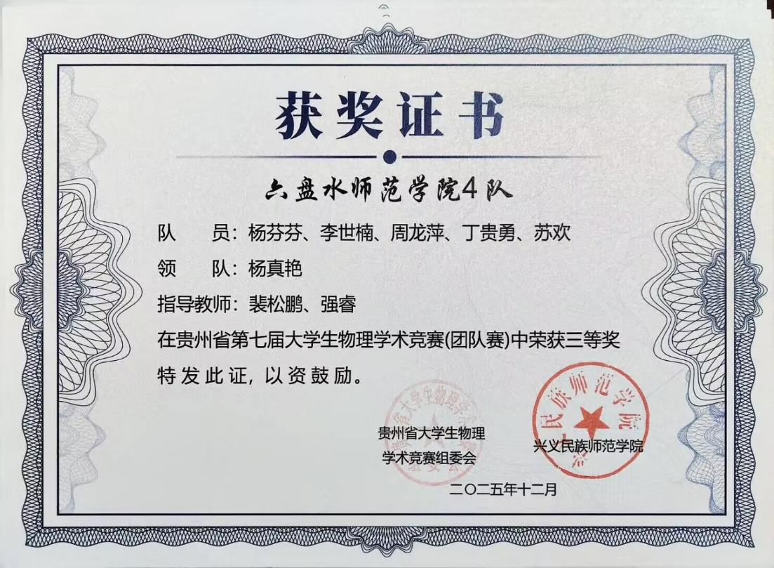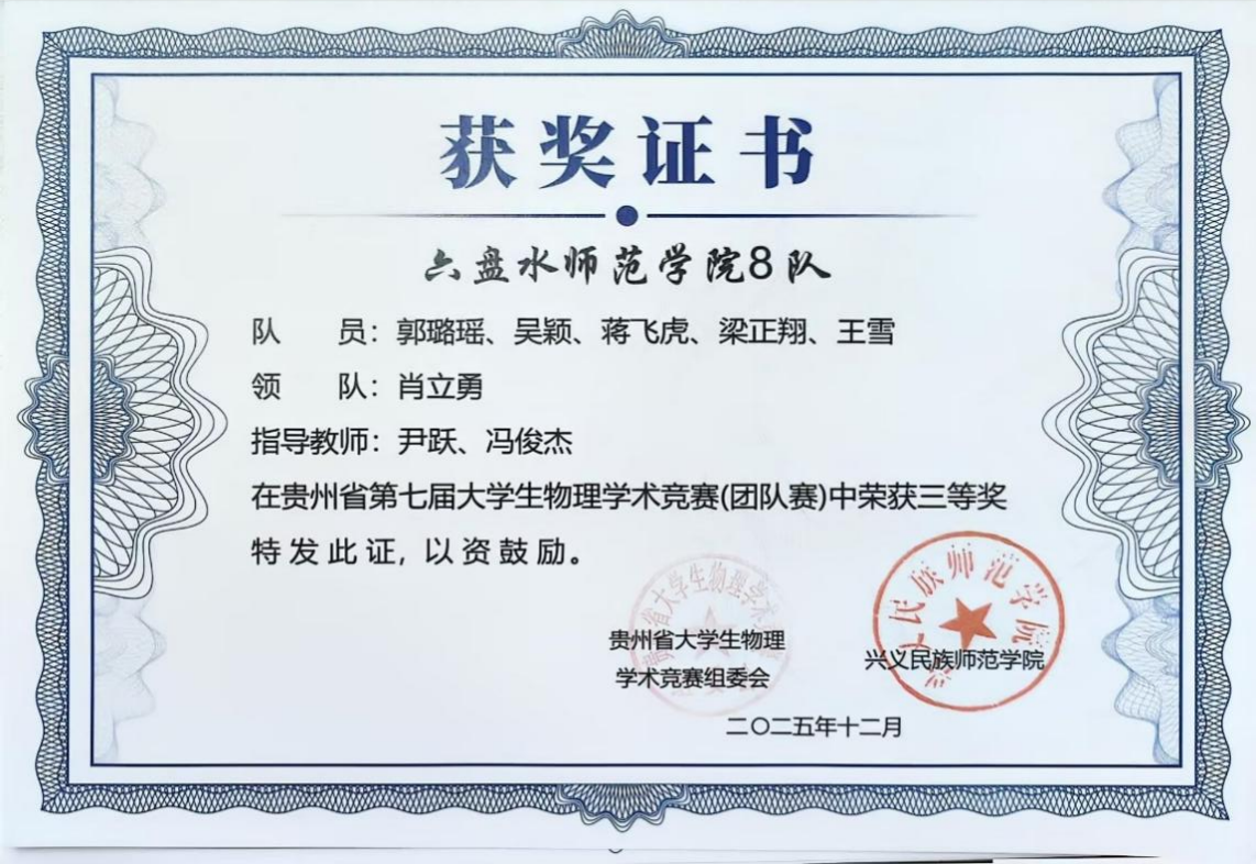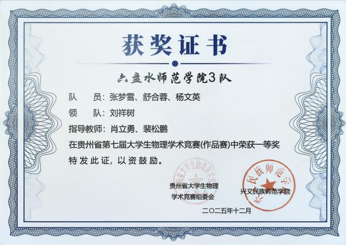 优异成绩的取得,离不开学院系统化的人才培养与竞赛支持。我院学子在贵州省物理学术竞赛中再创佳绩,充分彰显了 “会提问、会探究、会实验、会总结、会交流” 这一“五会”培养理念的实践成效。物理与电气工程学院将继续坚持以学生为中心,深化教育教学改革,将“五会”理念更深层次地融入课程体系和实践活动,不断激发学生的科学兴趣与创新潜能。(供稿/尹跃 编辑校对/詹建红 审核/张毓福)