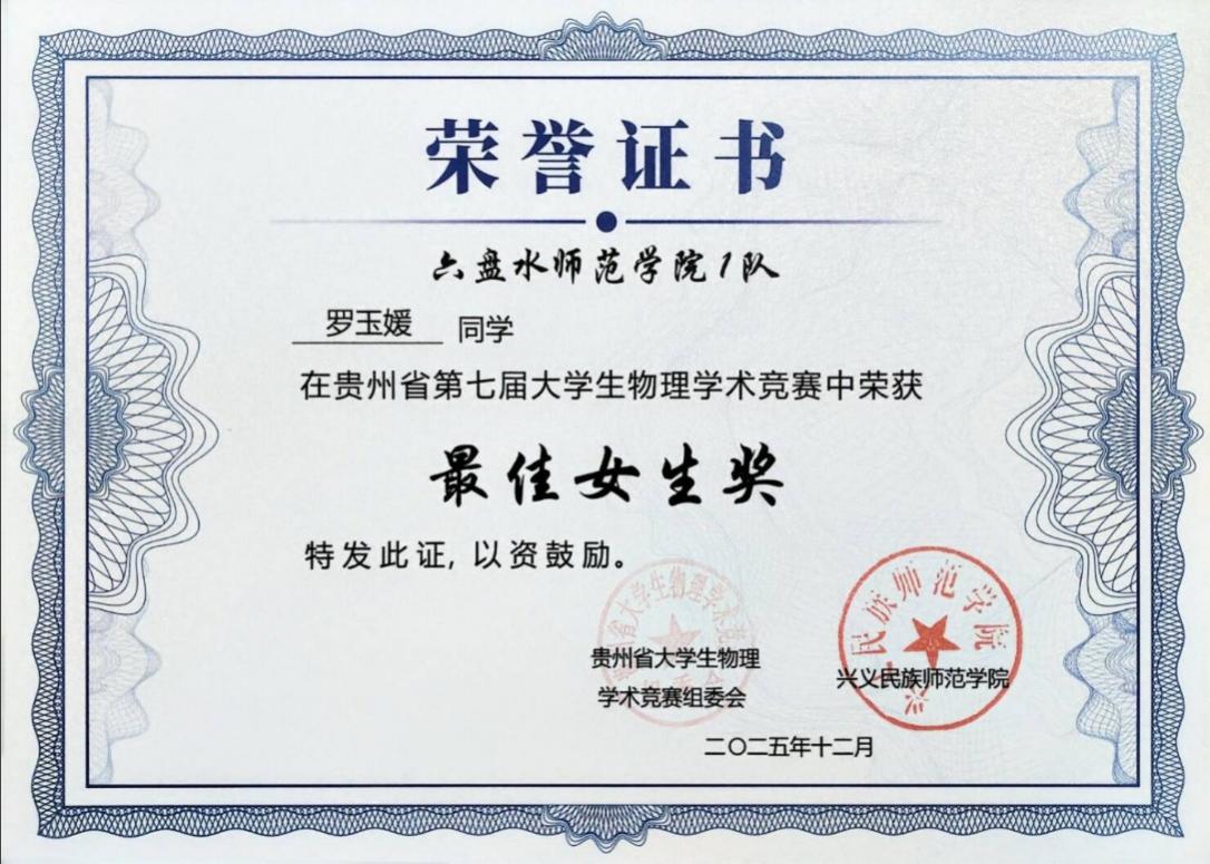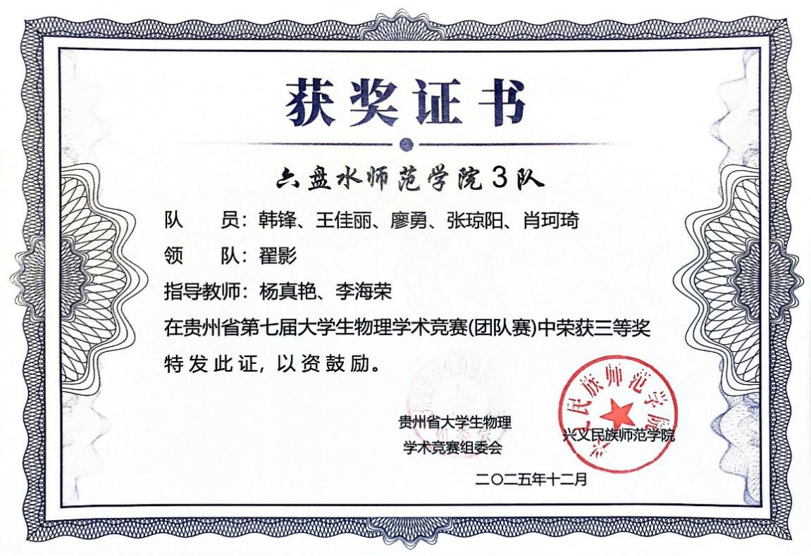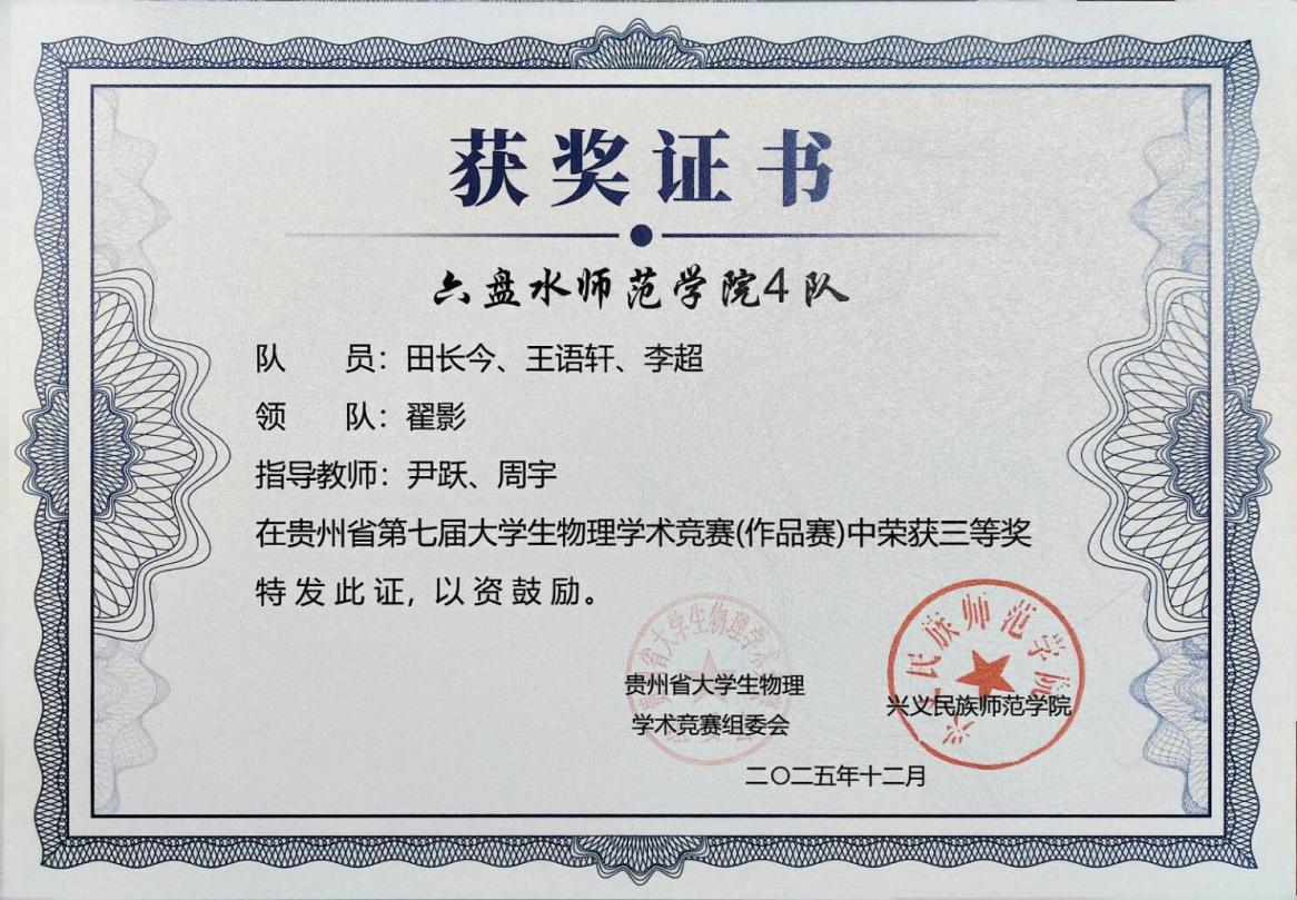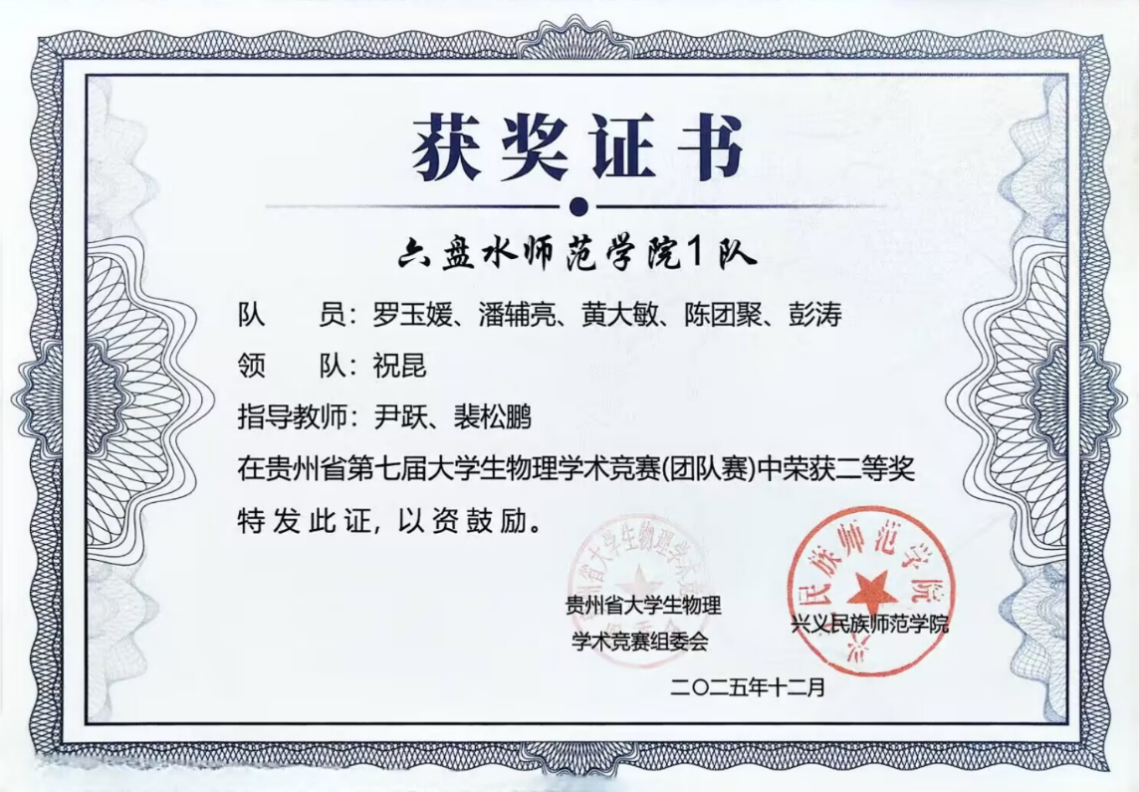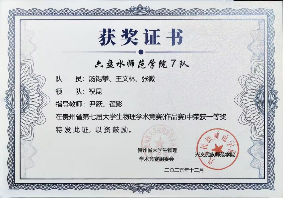 优异成绩的取得,离不开学院系统化的人才培养与竞赛支持。我院学子在贵州省物理学术竞赛中再创佳绩,充分彰显了 “会提问、会探究、会实验、会总结、会交流” 这一“五会”培养理念的实践成效。物理与电气工程学院将继续坚持以学生为中心,深化教育教学改革,将“五会”理念更深层次地融入课程体系和实践活动,不断激发学生的科学兴趣与创新潜能。(供稿/尹跃 编辑校对/詹建红 审核/张毓福)