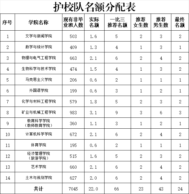 三、名额分配:其中正、副队长由保卫处安排原有护校工作经验丰富的同学担任,剩余22名队员按照各学院非毕业班学生人数在全校非毕业班学生总数中的比例分配,由于护校工作性质特殊,故女生人数限定为8名(非毕业班学生共计7045人,平均约320名学生中招募1名护校队员),各学院分配名额见《附表》。