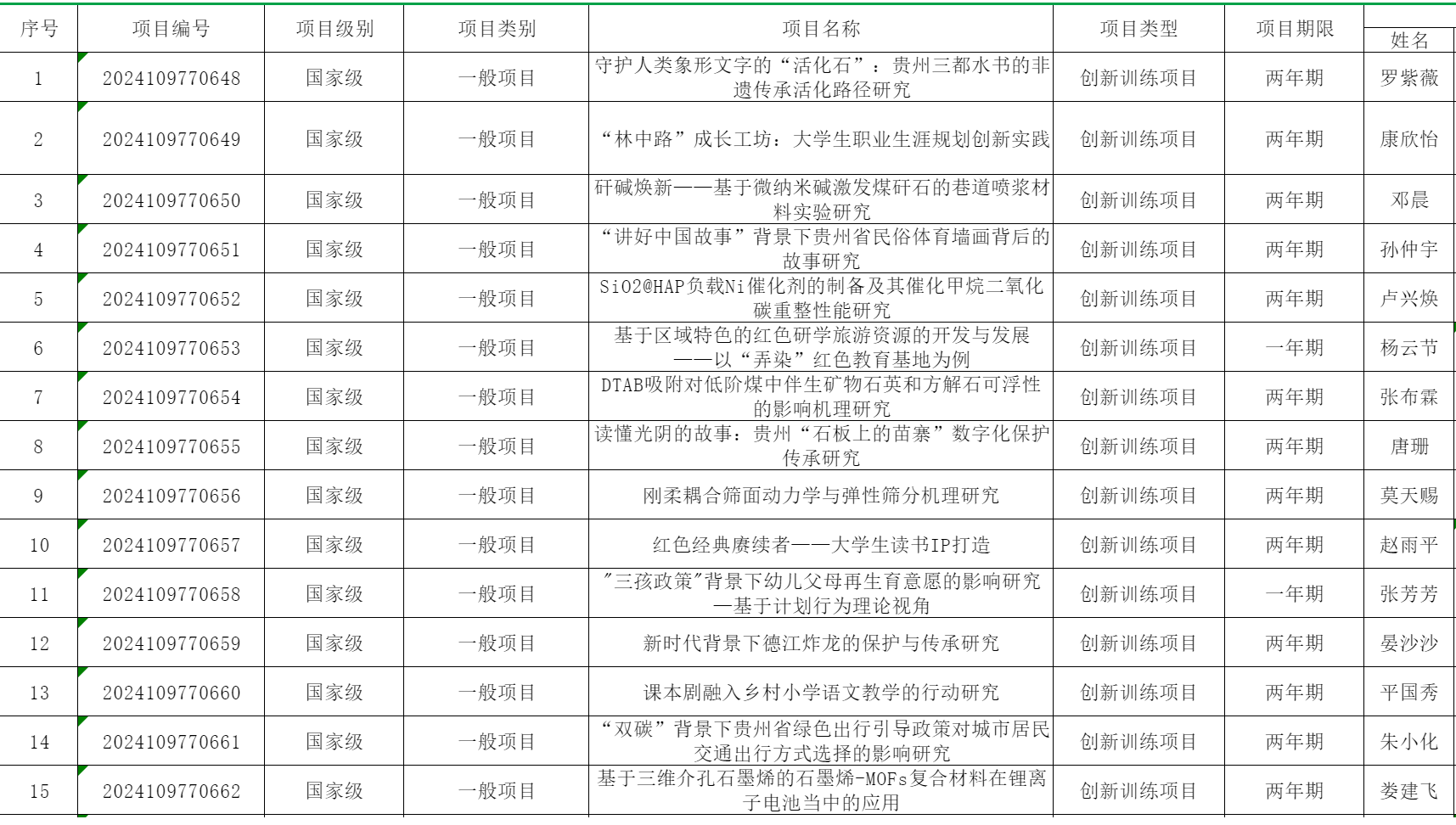 近日,根据《省教育厅办公室关于公布 2024 年贵州省大学生创新创业训练计划项目立项及省级项目立项名单的通知》,我院共有50个项目获国家级立项,其中包括重点支持领域项目1项;另有160个项目获得省级立项。这些项目的成功立项,体现了学校在创新创业教育方面的深厚底蕴,彰显了我校学生在科研探索和创新实践中的卓越能力。(图文/梁华杰 编辑/宫方俊 校对/杨丹 审核/周晓玉)