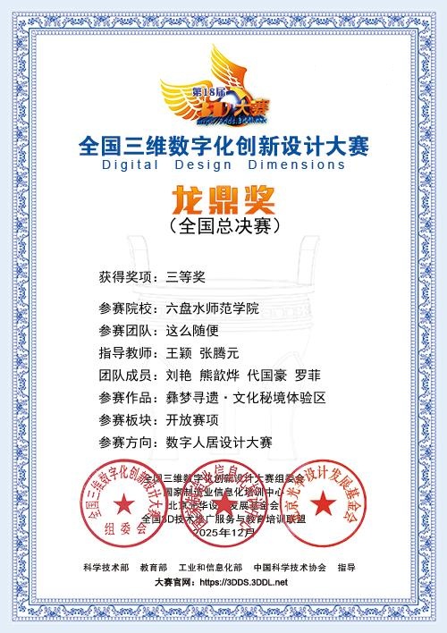 近日,2025年第18届全国三维数字化创新设计大赛年度总决赛圆满落幕。在王颖、张腾元两位老师的指导下,由刘艳、熊歆烨、代国豪、罗菲四位同学组成的参赛团队,凭借扎实的专业基础、出色的创新设计能力与默契的团队协作,在竞争激烈的数字人居设计大赛赛道中脱颖而出,最终荣获全国三等奖,为学校赢得了荣誉。