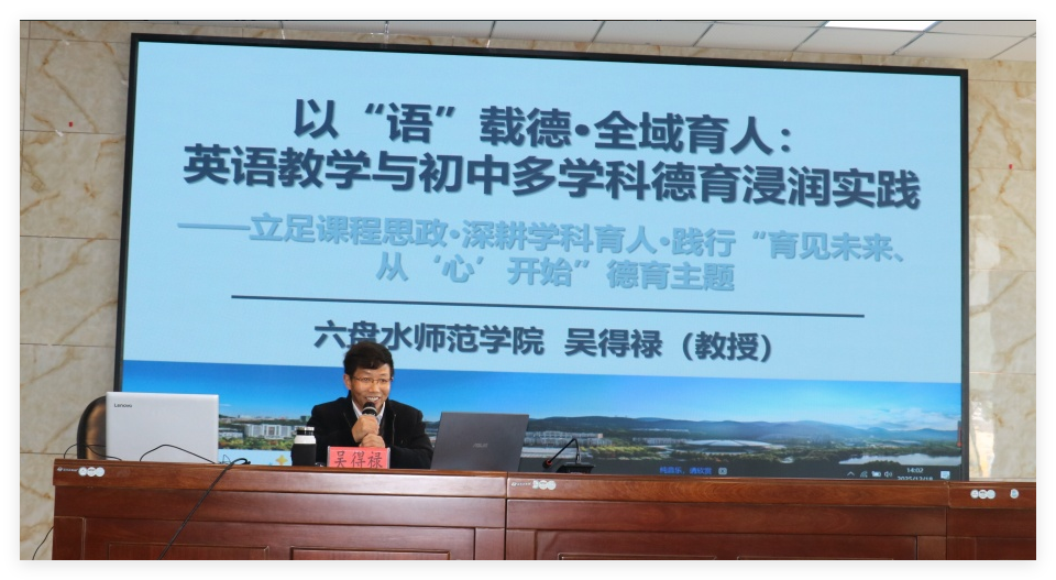 吴得禄教授以初中英语学科为切入点,结合“立足课程思政 深耕学科育人”的核心思路,围绕“德育如何融入初中多学科课堂”展开专题分享与课堂示范,并结合“初中多学科德育浸润实践”的具体案例,与基层教师展开深度研讨。参与活动的乡村教师表示,吴得禄教授的分享既有理论高度,又贴合基层教学实际,为乡村初中多学科德育实践打开了新视野。