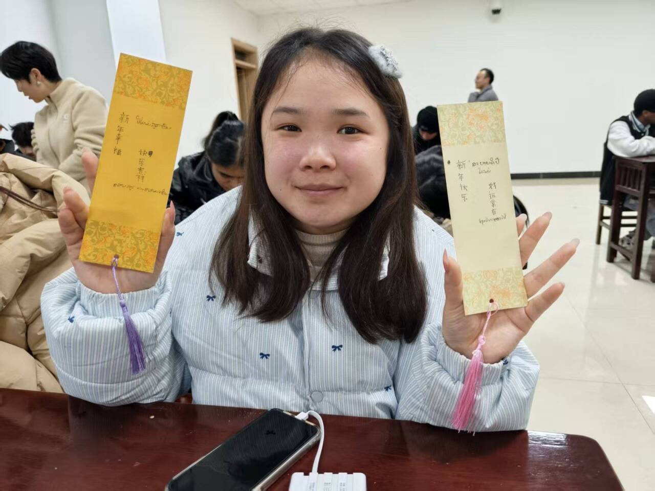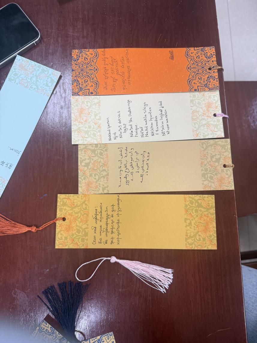 教师通过PPT课件、书写示范视频,详细讲解中国硬笔书法的基本特点、汉字笔画与结构规律,以及 “福”“吉祥”“安康” 等常用新年吉语的文化寓意与书写技巧,留学生们认真聆听、积极提问。70分钟的创作环节里,留学生们在书签上精心构思、落笔成文,中文的方正隽永和母语的独特韵味交相辉映——他们反复打磨每一个字符,有的在书签左侧书写工整的中文吉语,右侧搭配本国语言的祝福短句;有的将两种文字错落排版,用中文笔画的刚劲呼应母语字母的柔美。将对中国文化的喜爱、对新年的期盼与对亲友的牵挂,一同凝注于方寸书签之上。在互动阶段,留学生们走上前,分享自己书写的吉语含义与创作心得、互赠书签,现场洋溢着跨文化交流的温暖氛围。