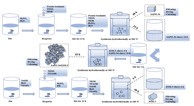 该研究创新性地采用原位两步法构建了SAPO-34/ZSM-5复合分子筛。在合成过程中,母相ZSM-5的晶化前驱液形成碱性环境,促使核相SAPO-34骨架发生蚀解,产生独特的界面效应,实现了酸强度、元素分布、粒径及孔结构的精准调控。在甲醇制烯烃(MTO)反应中表现出优异的催化性能:甲醇转化率达98%,低碳烯烃选择性达92.7%。同时,ZSM-5的引入与丰富的介孔结构有效促进了积碳前驱体的扩散与排出,较小的粒径抑制了烯烃二次反应,使催化剂展现出显著的抗积碳失活能力。