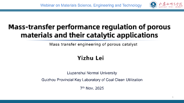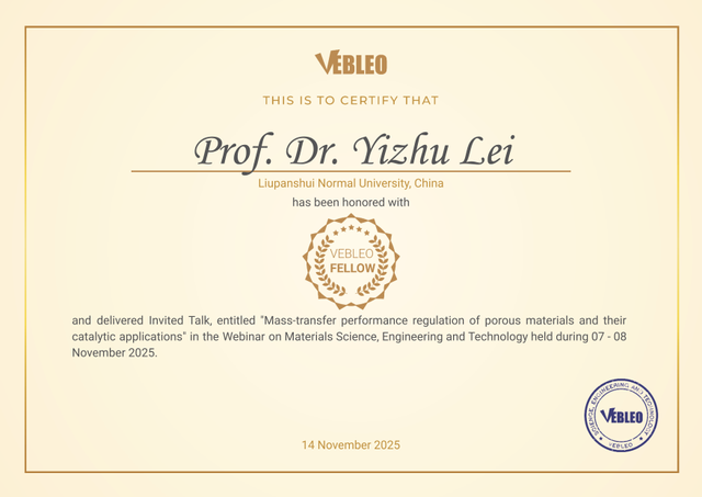 2025年11月,我校雷以柱教授被授予国际科学组织VEBLEO协会会士(VEBLEO Fellow),并受邀在VEBLEO于2025年11月7日至8日举行的材料科学、工程与技术网络研讨会(Webinar on Materials Science, Engineering and Technology)上做主题为“Mass-transfer performance regulation of porous materials and their catalytic applications”的邀请报告。