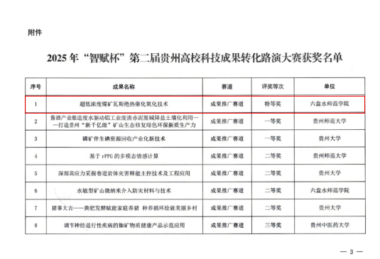 近日,贵州省教育厅等四部门公布了《2025年“智赋杯”第二届贵州高校科技成果转化路演大赛获奖名单》,我院雷以柱教授团队凭借“超低浓度煤矿瓦斯绝热催化氧化技术”,荣获成果推广赛道特等奖。