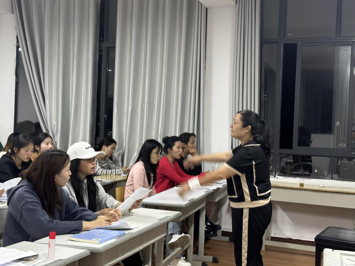 为提升合唱专业水准,学院特别邀请艺术学院赵蓉老师全程指导。拥有丰富合唱指导经验的赵老师,针对两首曲目的风格差异制定了个性化排练方案:指导《保卫黄河》时,她强调气息的爆发力与声部的层次感,让激昂旋律传递出民族力量;排练《万疆》时,她注重情感的细腻表达与音色的柔美统一,引导师生用歌声诉说对祖国山河的热爱。在赵老师的耐心指导下,队伍的演唱技巧与整体默契度不断提升。