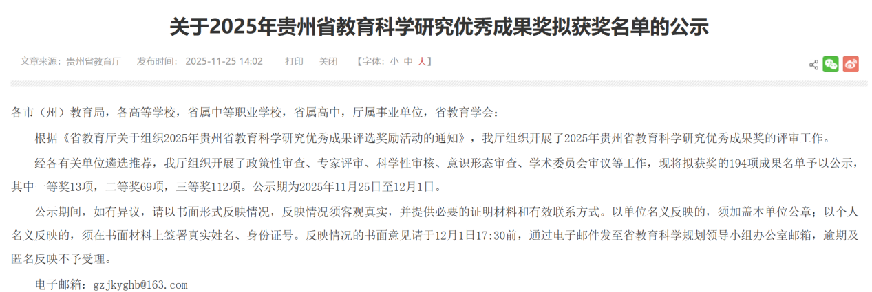 近日,贵州省教育厅2025年教育科学研究优秀成果奖获奖名单正式公布。我院杨承玥老师主编的教材《旅游公共关系》荣获教材类三等奖。