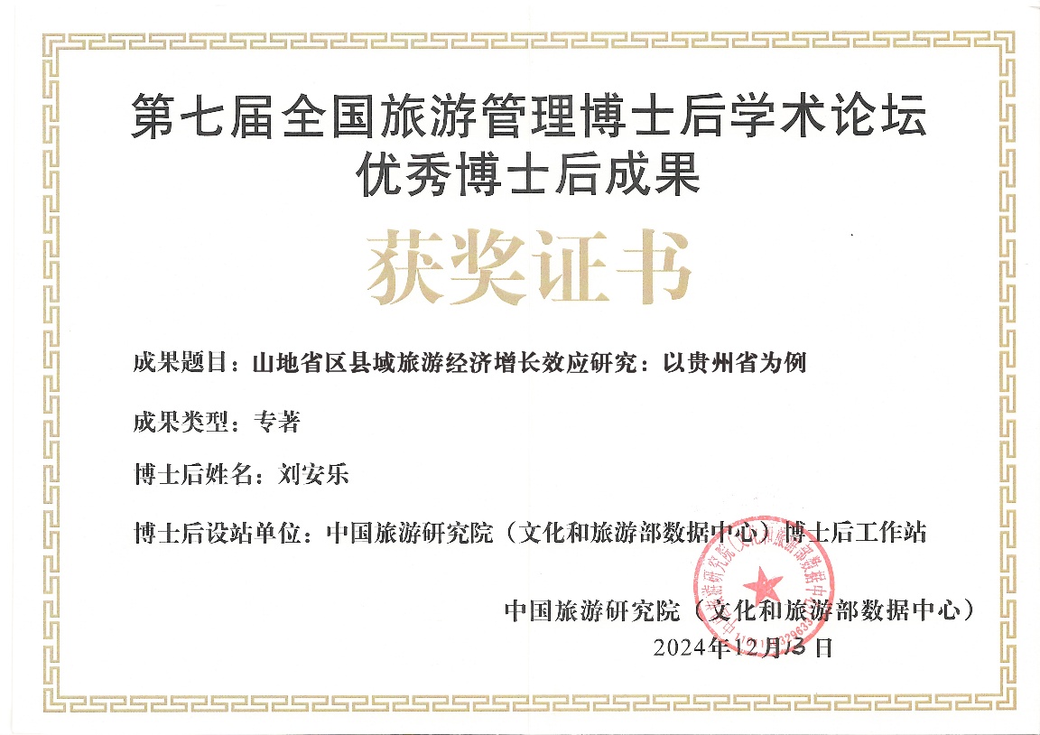 12月19-20日第七届全国旅游管理博士后学术论坛在上海召开。会上公布了“全国旅游管理博士后学术交流活动优秀博士后成果名单”,中国旅游研究院院长戴斌为奖获者颁发获奖证书。我校旅游管理系教师、中国旅游研究院在站博士后刘安乐副教授的专著《山地省区县域旅游经济增长效应研究——以贵州省为例》荣获专著类优秀成果。