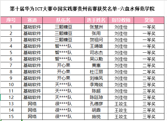 近日,第十届华为ICT大赛中国实践赛贵州省赛圆满落幕。我院刘佳怡、王竣生两位教师指导的五个团队在基础软件赛道中佳绩频传。张慧洲、张用、贺祖问团队和王靖雄、司志杰、吴以勒团队获一等奖;黄惠、杜江丽、刘维凤团队获二等奖;李海燚、陈超、陈廷琼团队和孔德彦胡鼎、施悦团队获三等奖。(供稿/朱玲 编辑校对/陈体健 审核/吕选周)