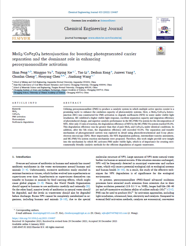 近日,冯姗老师研究成果以“MoS2/CoFe2O4 heterojuncti-on for boosting photogenerated carrier”为题,在国际权威期刊《Chemical Engineering Journal》(中科院一区,IF=13.2)上发表。