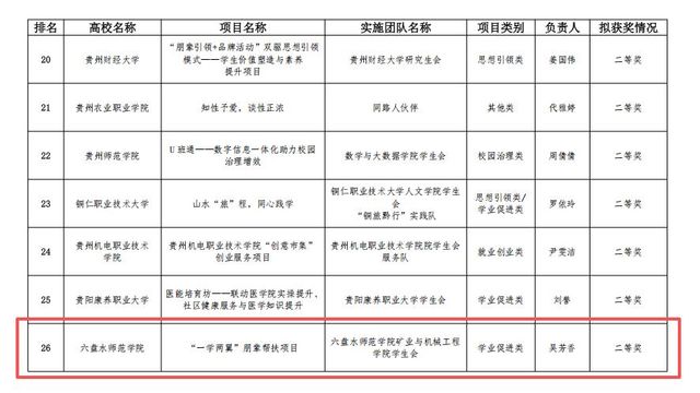 近日,贵州团省委公布了2025年贵州省高校学生会(研究生会) 服务学生项目大赛拟获奖名单,矿业与机械工程学院学生会“一学两翼”朋辈帮扶项目(学业促进类,负责人吴芳香)获二等奖。(供稿/蒋涛涛 编辑校对/初瑛 审核/卢香宇)