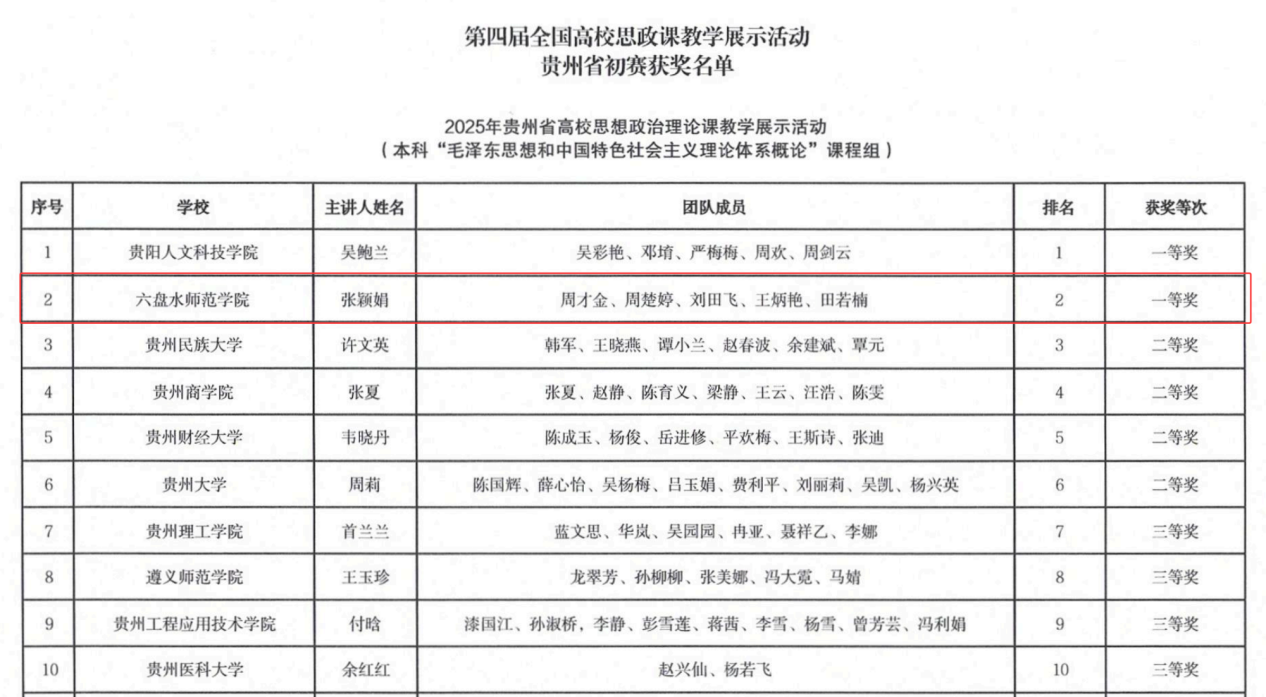 近日,第四届全国高校思政课教学展示活动贵州省初赛结果揭晓,马克思主义学院张颖娟教师团队在本科“毛泽东思想和中国特色社会主义理论体系概论” 课程组中荣获一等奖,排名全省第二。