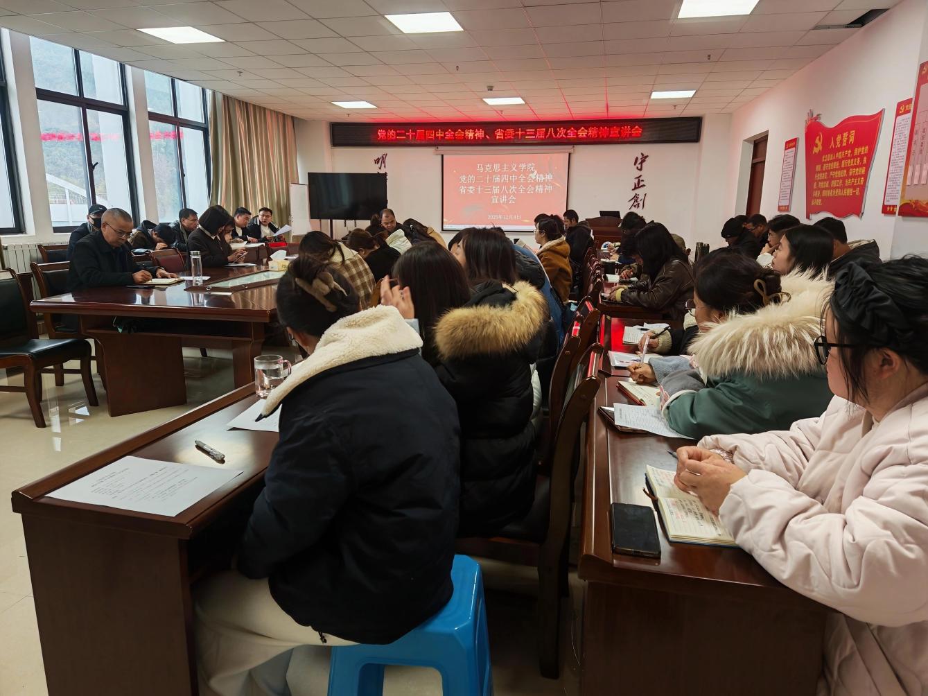 12月8日,马克思主义学院在奥学楼1008会议室召开党的二十届四中全会精神、省委十三届八次全会精神宣讲会,学院党委书记杨永贵宣讲,学院全体师生党员、群众代表参加宣讲会。
