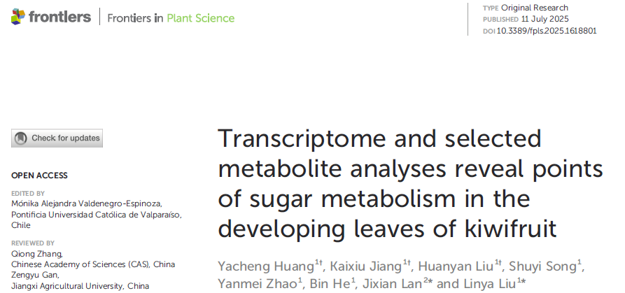 2025年7月13日,我校生物科学与技术学院黄亚成副教授作为第一作者,刘林娅副教授作为通讯作者的研究论文《Transcriptome and selected metabolite analyses reveal points of sugar metabolism in the developing leaves of kiwifruit》在国际植物科学领域知名期刊《Frontiers in Plant Science》(JCR Q1区,中科院二区)上正式发表。