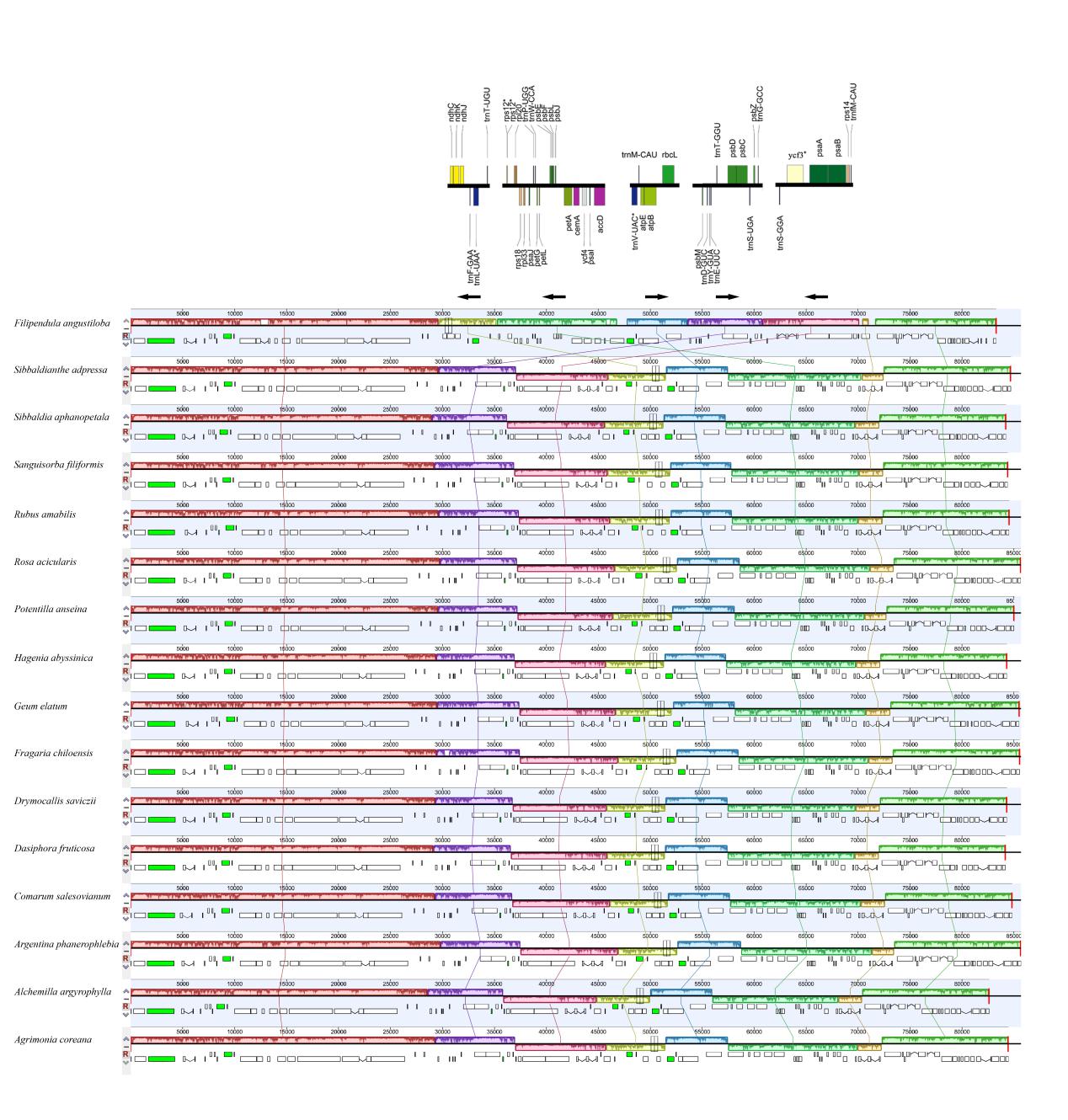 该研究首次分析了7种蚊子草属植物的完整叶绿体基因组结构。研究结果表明,蚊子草属植物的叶绿体基因组大小在154,205到154,633 bp之间,平均GC含量为36.63%。注释的126个基因在属内具有相同的顺序和方向,但与蔷薇亚科Rosoideae 其他属相比存在结构差异,包括基因丢失、转座和倒位等现象。此外,在每个蚊子草属植物的叶绿体基因组中都观察到了不同数量的SSR,序列差异主要发生在非编码区域,其中发现了四个突变热点。相比之下,只发现了两个正选择基因(matK 和 rps8)。系统发育和分子钟分析表明,蚊子草属植物与蔷薇亚科其他属的分化大约发生在 82.88百万年,来自东亚的蚊子草属植物大约在9.64百万年前分化成两个主要分支。这些结果为进一步研究蚊子草属的分类提供了依据。