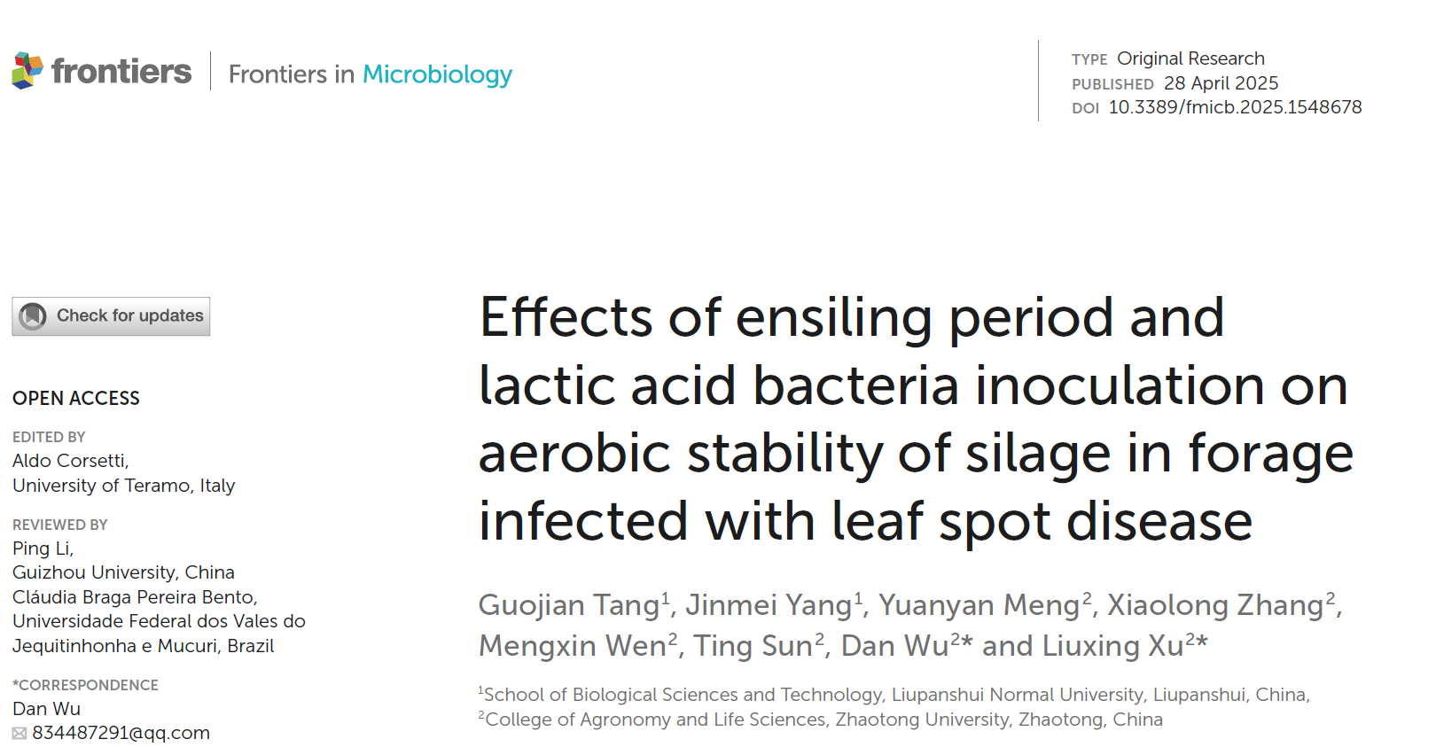 2025年4月28日,我校生物科学与技术学院唐国建副教授作为第一作者的研究论文《Effects of ensiling period and lactic acid bacteria inoculation on aerobic stability of silage in forage infected with leaf spot disease》在国际微生物学领域知名期刊《Frontiers in Microbiology》(JCR Q1区,中科院二区)上正式发表。