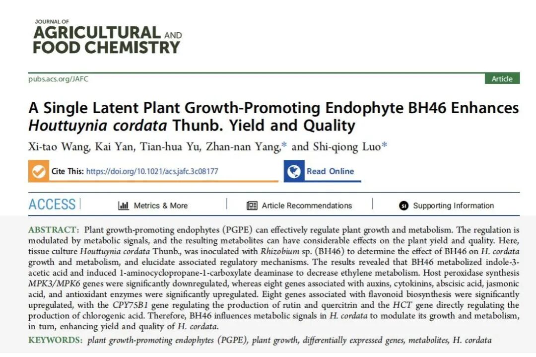 2024年5月,我校与贵州师范大学杨占南教授团队在农业科学领域中科院1区TOP期刊Journal of Agricultural and Food Chemistry(JAFC,IF=6.1)上发表了题为“A Single Latent Plant Growth-Promoting Endophyte BH46 Enhances Houttuynia cordata Thunb. Yield and Quality”的研究论文。