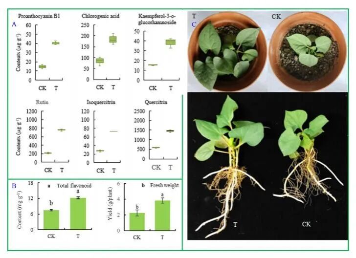 该研究从鱼腥草Houttuynia cordata Thunb.中发现一株潜在内生细菌BH46促进鱼腥草植株生长及黄酮组分的代谢累积。通过BH46与鱼腥草幼苗的共培养,与对照相比,鱼腥草生物量增加43.4%,总黄酮增加62.0%、黄酮组分原花青素B1、绿原酸、芦丁、阿福豆苷、异槲皮苷和槲皮苷的含量分别显著增加172.2%、117.1%、147.4%、249.1%、166.6%、152.2%。转录组和代谢组分析发现,BH46分泌IAA和ACCD调控生长激素信号基因SAUR、AHP、PP2C、ABF、JAZ、MYC2转录因子、CAT和SOD上调,AUX/IAA、MPK3/MPK6下调,促进植物根系和植株生长;调控黄酮代谢基因CHS、CPY75B1、ANR、ANS、DFR 和HCT上调,提高黄酮组分的代谢累积。