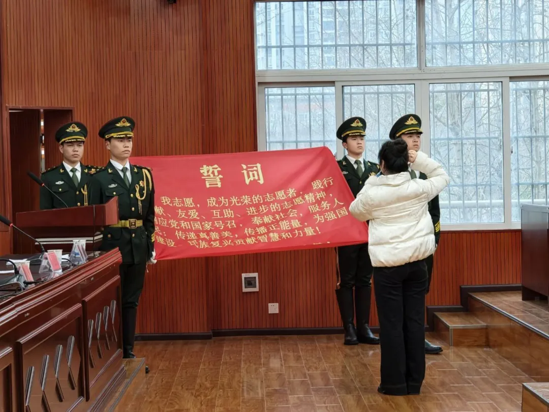 学雷锋活动月启动环节,陈文辉为学雷锋志愿服务队代表授旗,全体志愿者庄严宣誓。