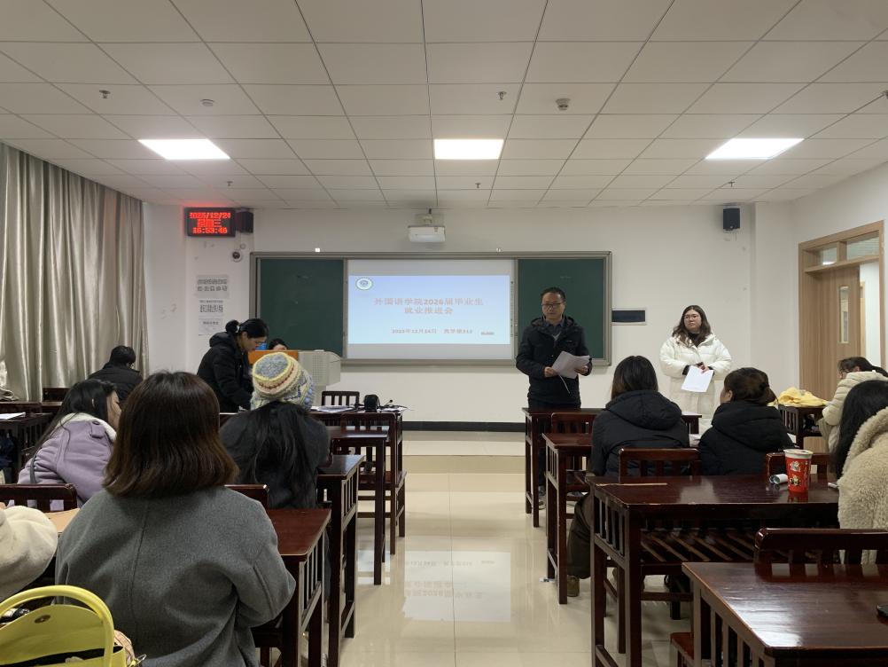 为拓宽毕业生就业渠道,精准对接企业用人需求,12月24日,外国语学院在勤学楼312教室举行“2026届毕业生就业推进会”。外国语学院党委书记谭兰、副书记蔡小雄参加推进会,会议由辅导员张中梅主持,2026届80余名毕业生参加本次就业推进会。
