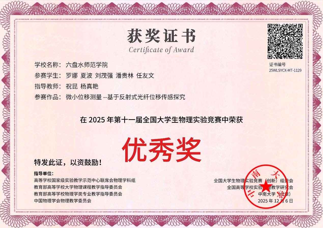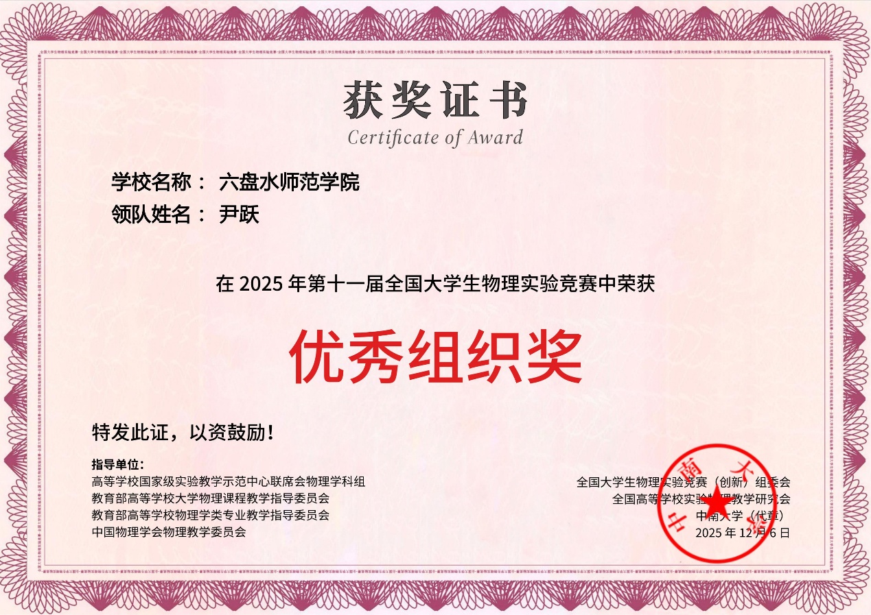 11月21日至23日,2025年第十一届全国大学生物理实验竞赛(创新)决赛在中南大学举行。本届竞赛共有来自全国722所高校的2360支队伍报名参赛,最终有331所高校的750支队伍、2000余名师生脱颖而出,入围决赛。我校参赛的6支队伍表现出色,获得国家级二等奖1项、三等奖3项、优秀奖2项,学校获得“优秀组织奖”。