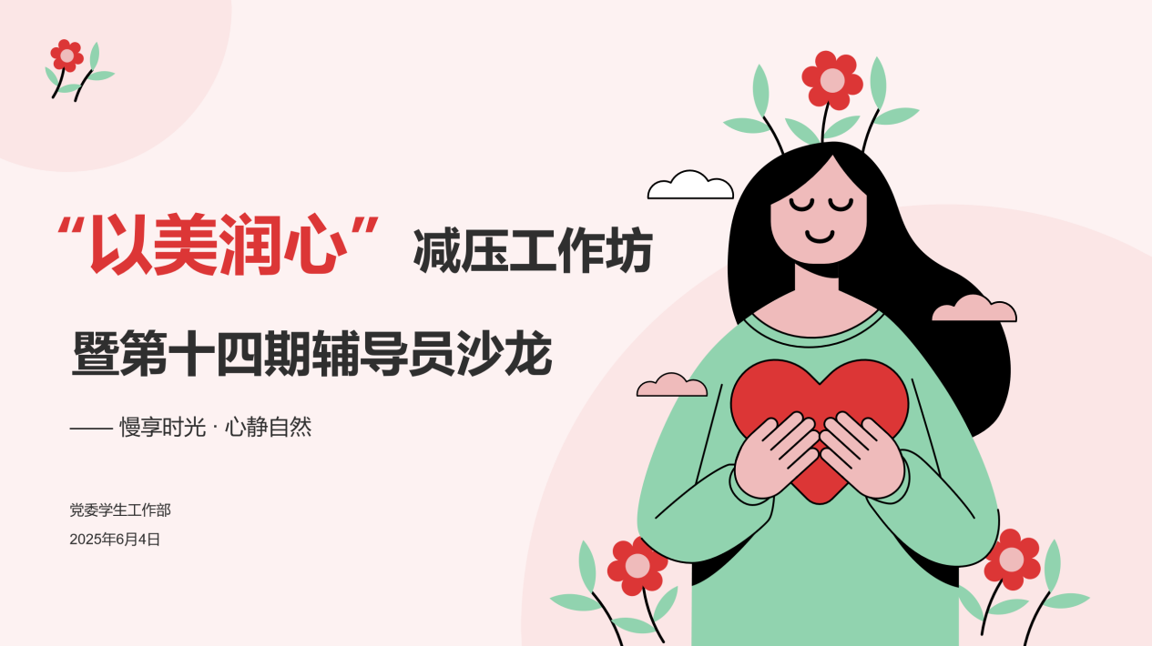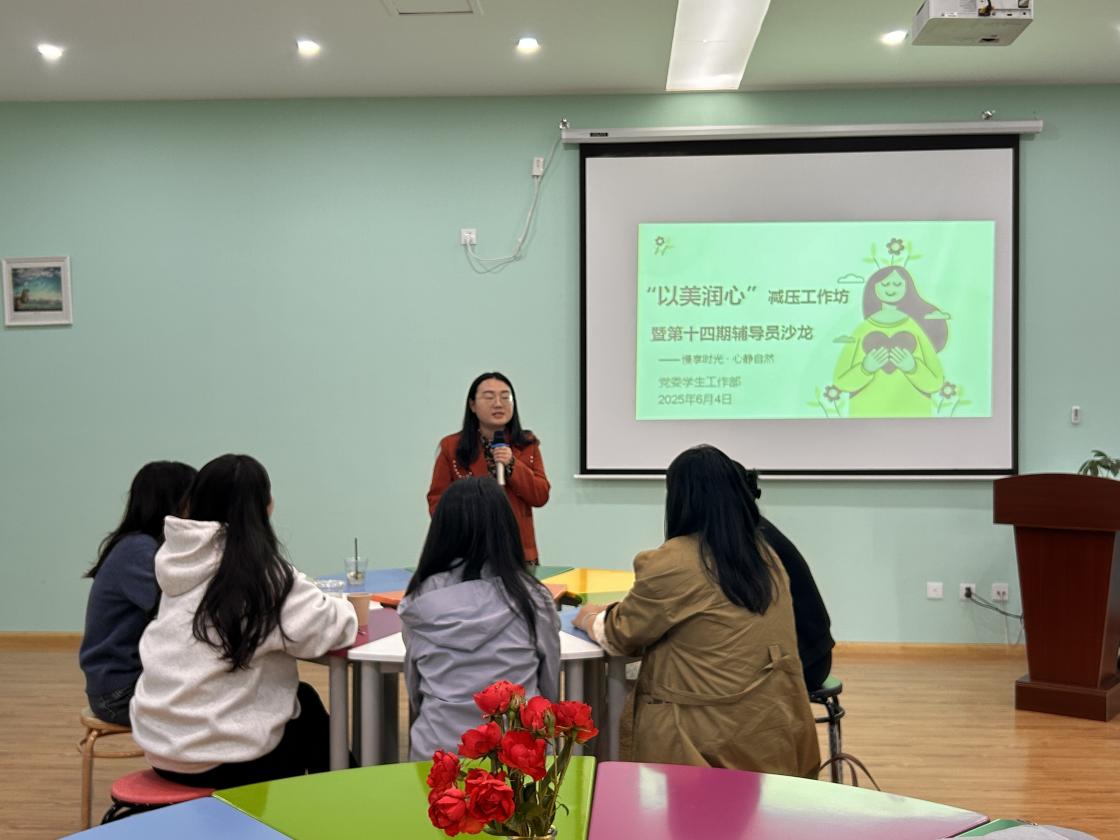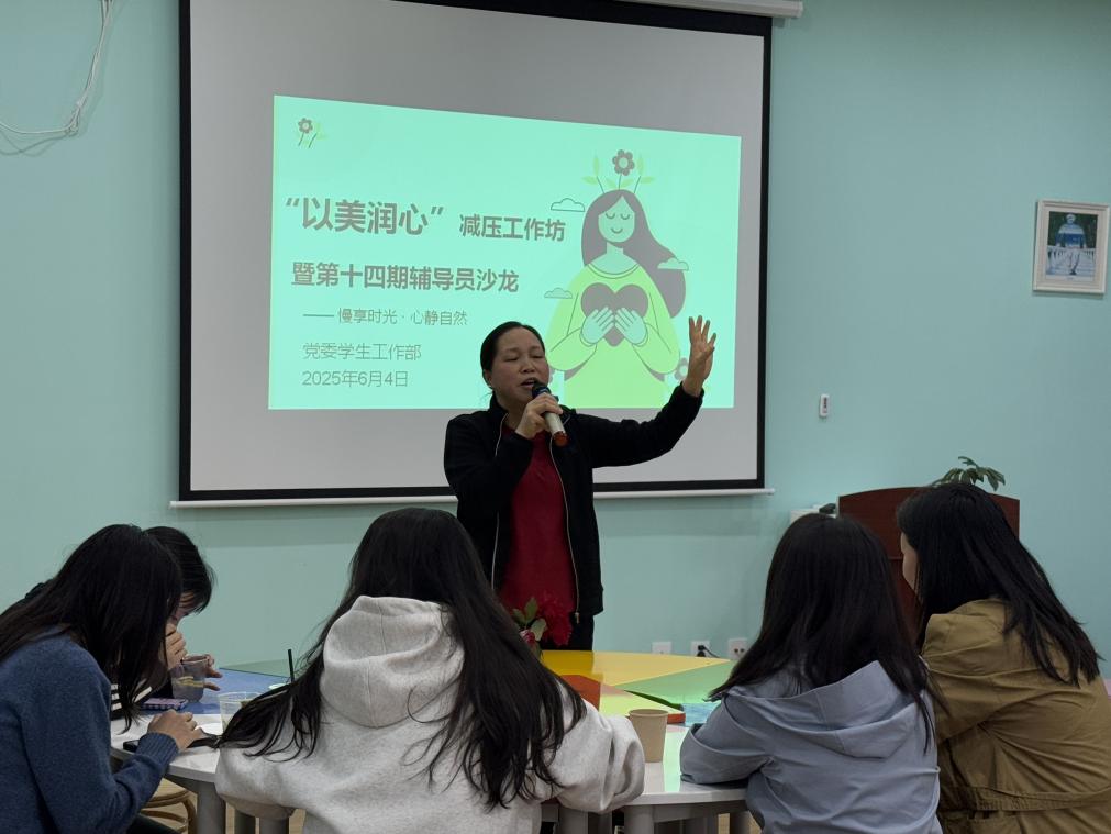 为进一步提升学校辅导员心理健康教育工作能力,将积极心理学深度融入学生工作实践,着力提升辅导员队伍心理健康水平与职业幸福感,2025年6月4日,党委学生工作部精心策划的“以美润心”减压工作坊暨第十四期辅导员沙龙在心理咨询中心顺利举行。本次活动由心理咨询中心主任郑元媛主持,我校全体辅导员参加。