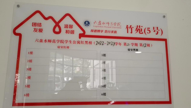 “红黑榜”上设置红榜和黑榜两个板块,以“周”为单位,由学工部牵头,楼长-层长-寝室长“三长”和公寓管理员协助,每周对公寓进行检查,根据检查情况,将评出的优秀寝室展示在“红榜”上,以供其他寝室学习。同时也会将寝室卫生较差及违规使用大功率电器等情况寝室展示在“黑榜”上,让同学们引以为戒,并将红黑榜寝室纳入文明寝室评选范围内。一红一黑,一目了然地让全体师生随时可见。