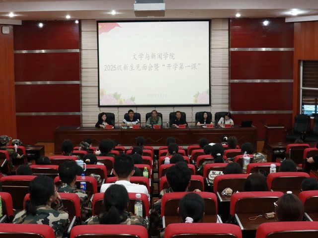 文学与新闻学院各系主任、科室负责人、新生辅导员、班主任及2025级全体新生参加此次会议。(文学与新闻学院供稿)