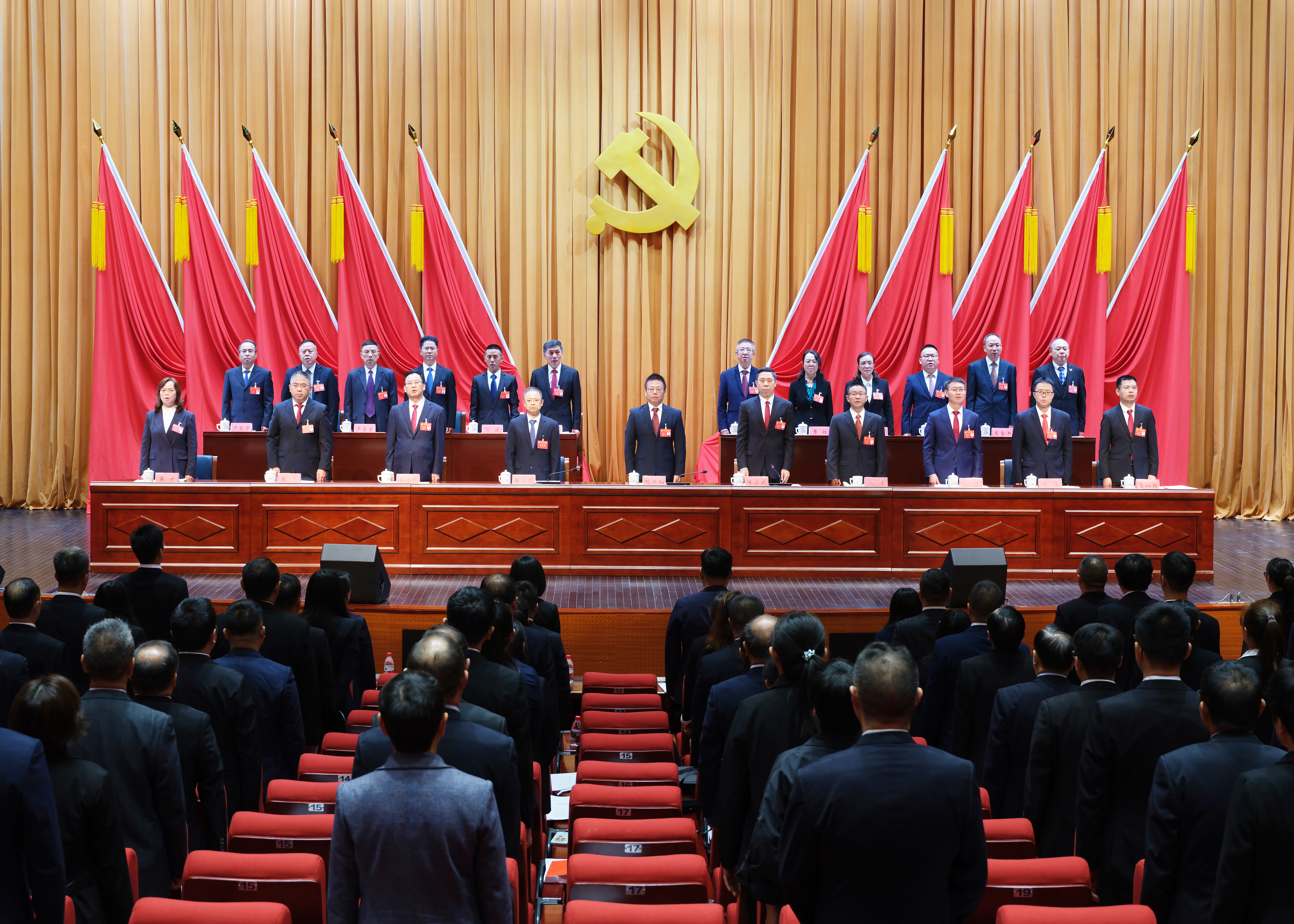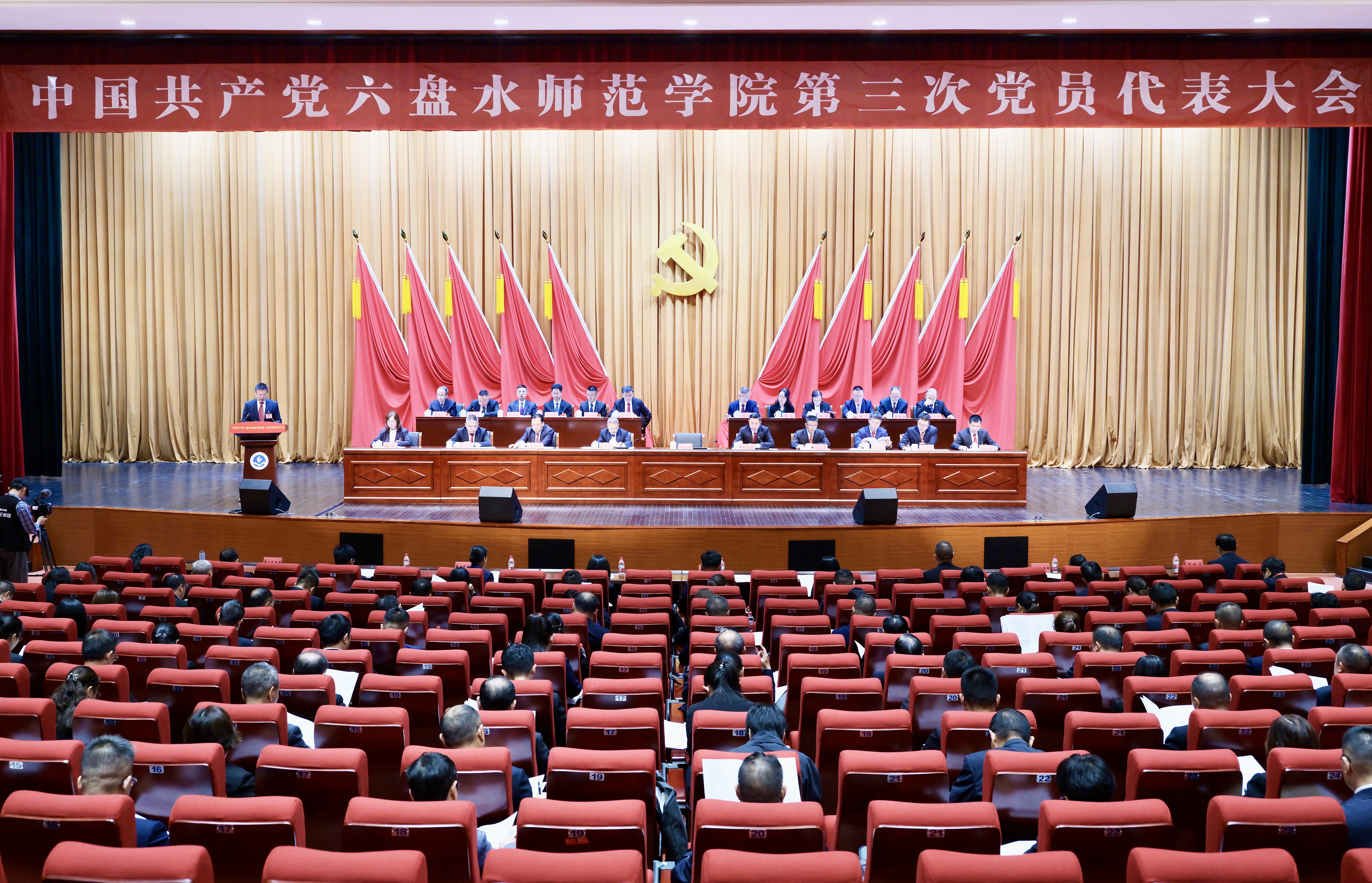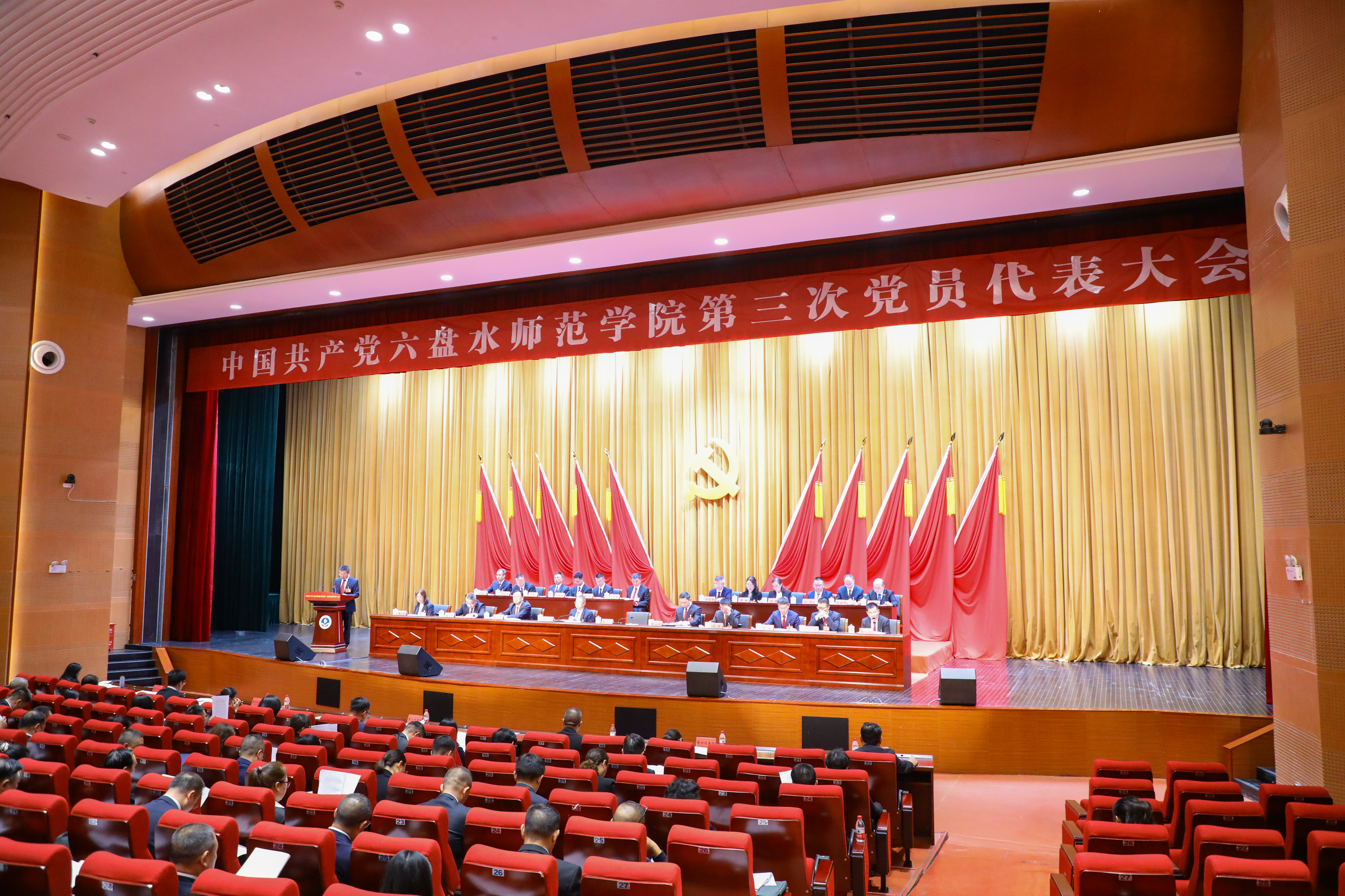 会场内气氛庄重热烈,主席台上方悬挂着“中国共产党六盘水师范学院第三次党员代表大会”会标,后幕悬挂的党徽在十面红旗的映衬下熠熠生辉。会场后方悬挂着“艰苦奋斗强担当 守正创新拓新局 全面开启建设地方性高水平应用型大学新征程”的横幅。